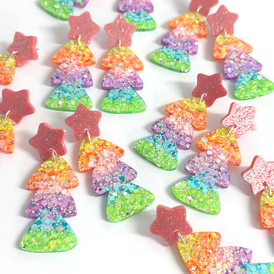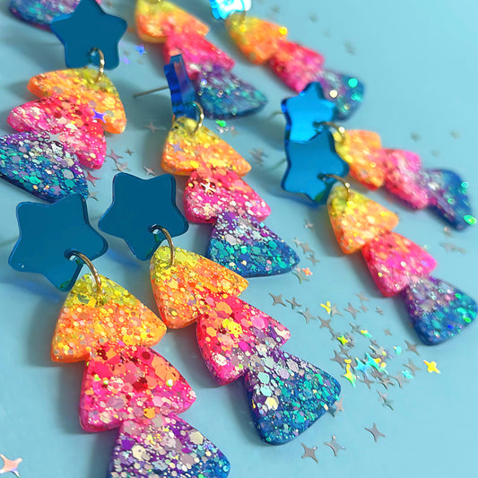 BRIGHT RAINBOW OMBRÈ CHRISTMAS TREES : Handmade Resin & Acrylic Stud-top DROP Earrings