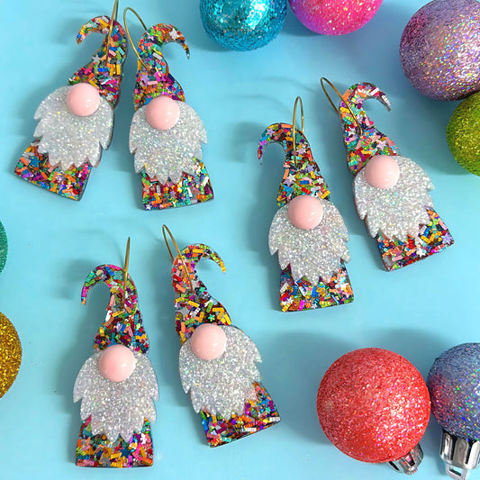 HELLO LITTLE SANTA GNOME : Rainbow Tinsel : Handmade Resin DROP Earrings