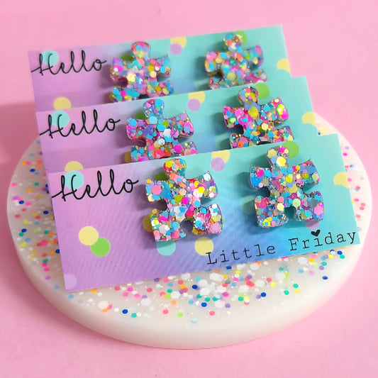 PUZZLE PIECES : RAINBOW CONFETTI : Handmade Resin STUD Earring