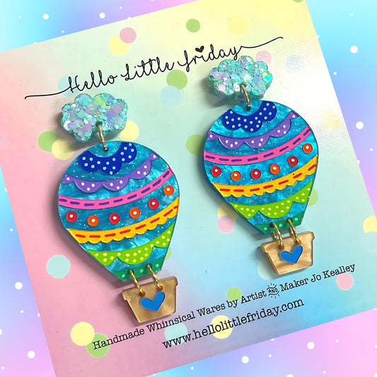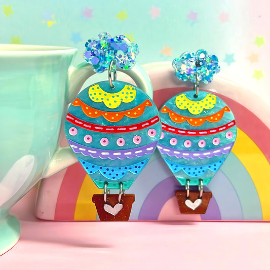 LET’S FLY AWAY : SKY BLUE SHIMMER HOT AIR BALLOONS : Handmade Resin & Acrylic Drop Earrings