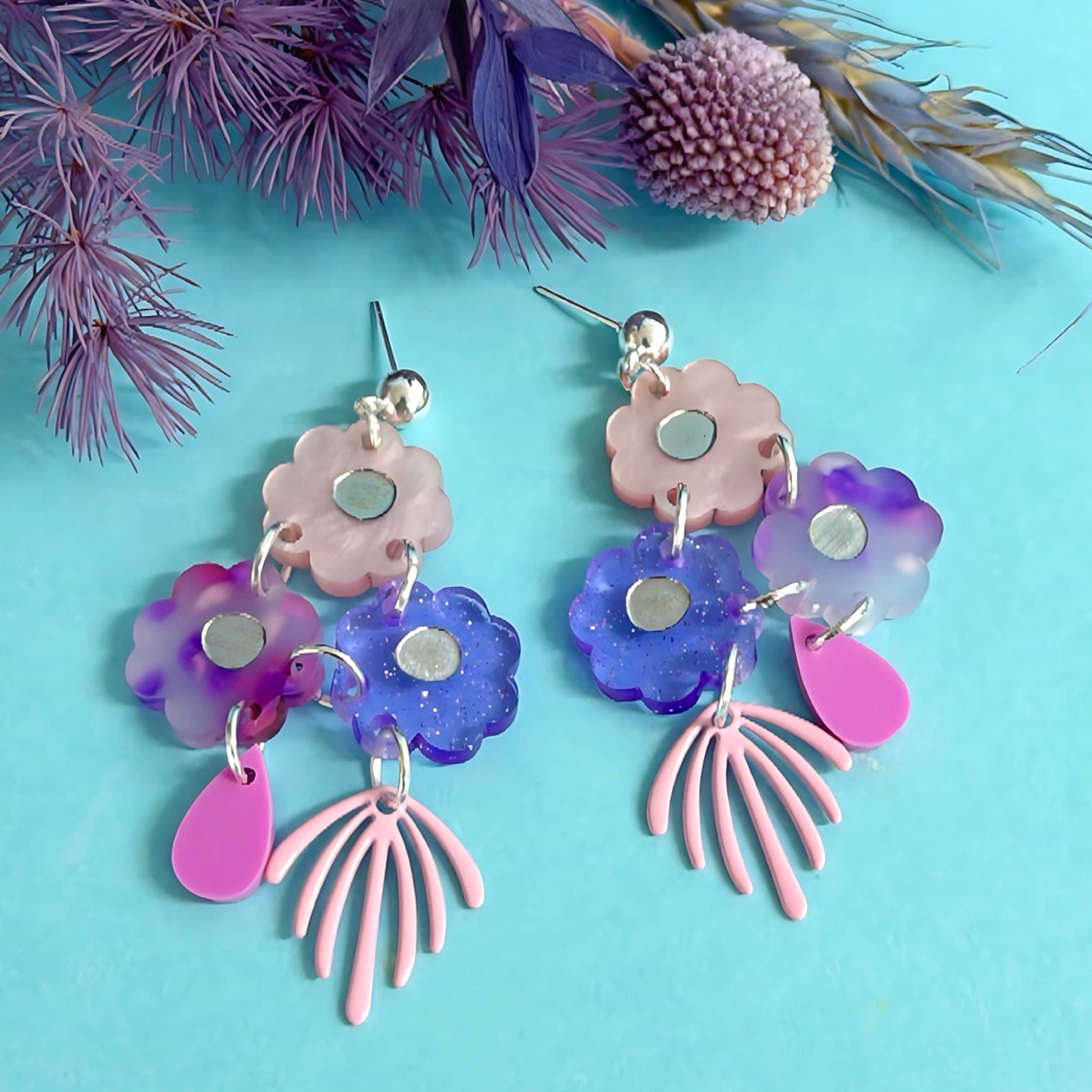 BEAUTIFUL BOUQUETS : Violets : Handmade Handpainted Acrylic DROP Earrings