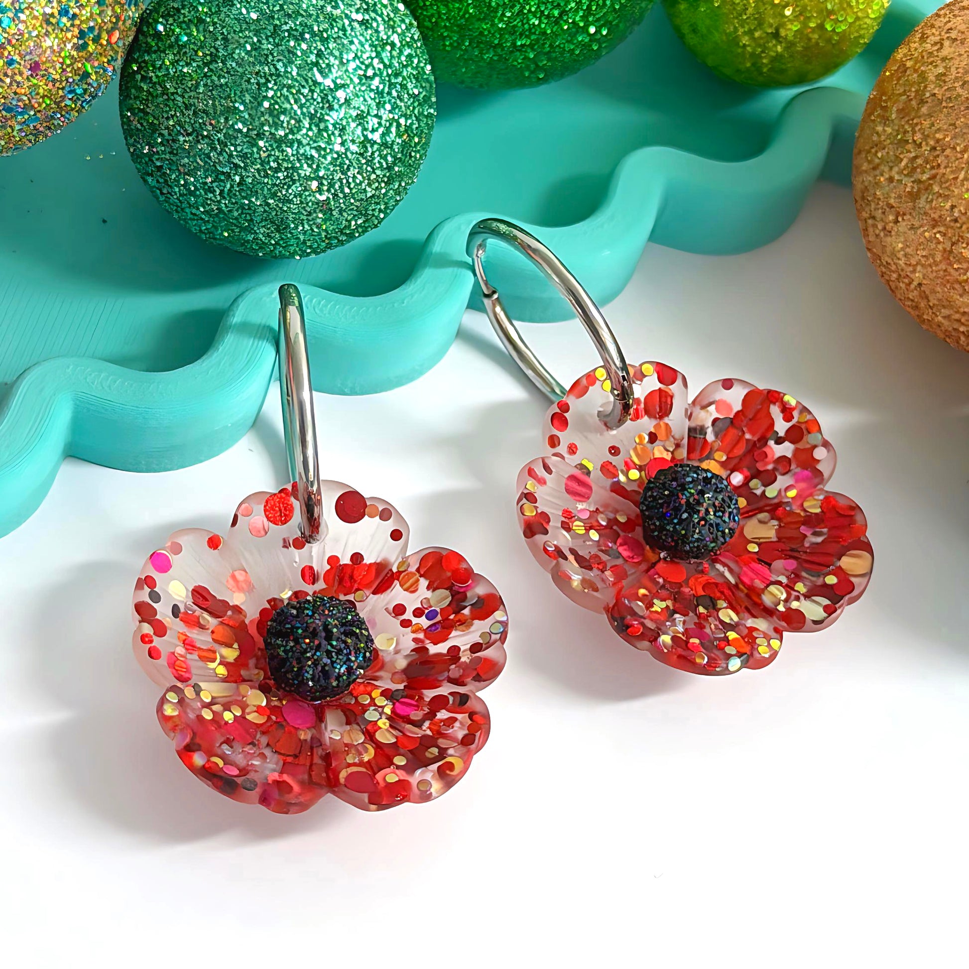CONFETTI POPPIES : CLASSIC RED : Handmade Resin Drop Earrings on Huggie Hoops
