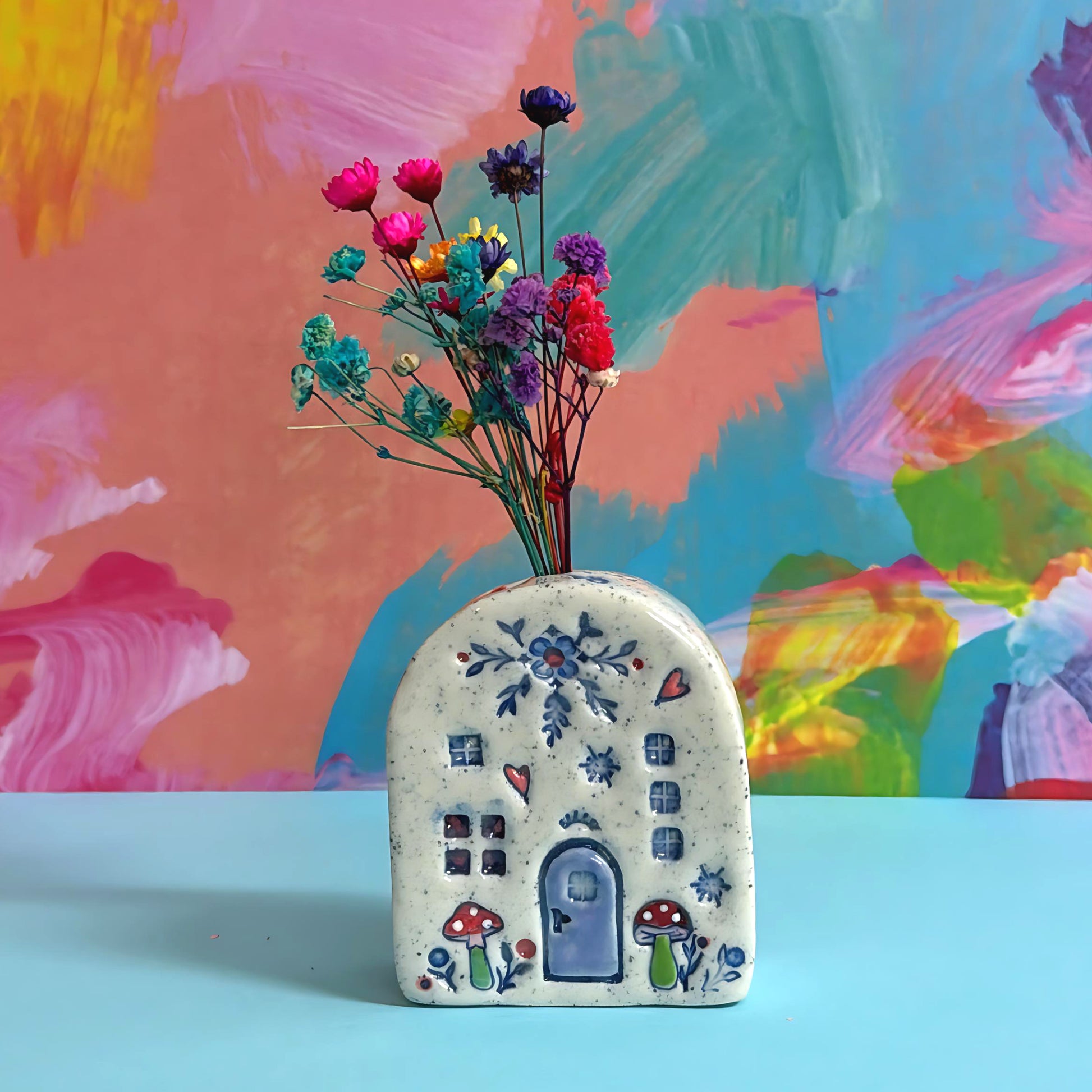 Each of these homes are formed by hand, starting with raw clay I sculpt & embellish them as one of a kind creations. Every home is signed on the base by me.