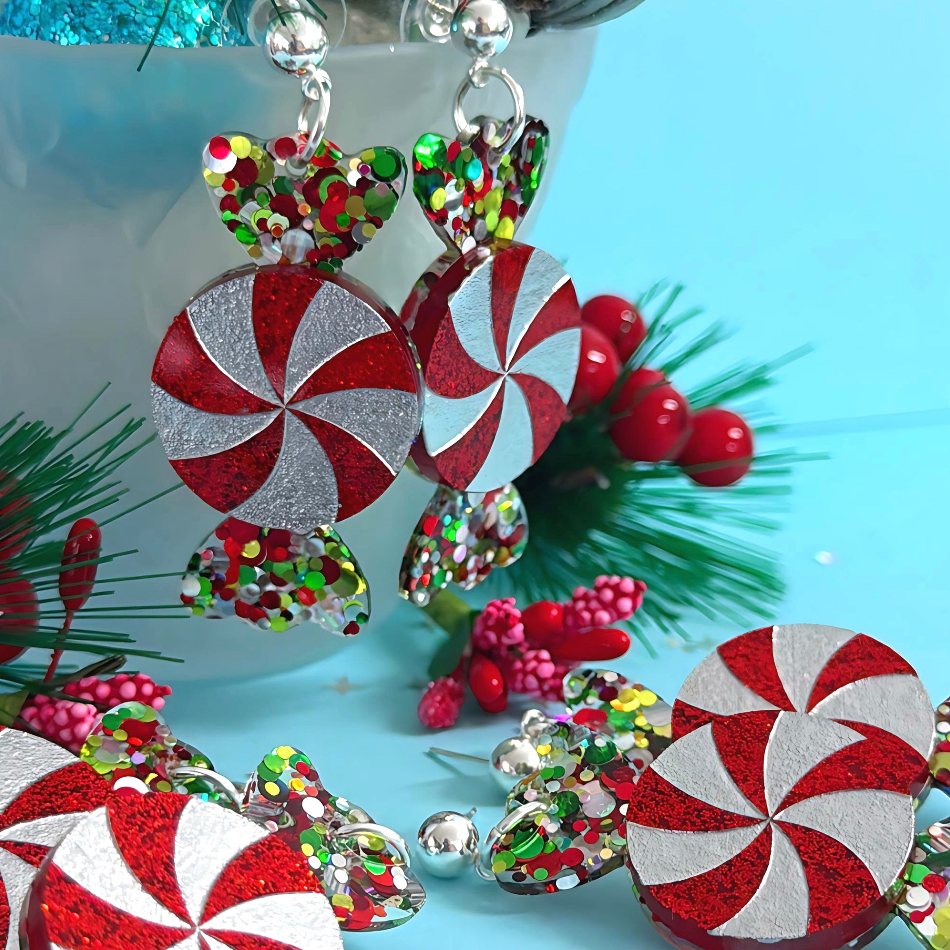 HELLO CHRISTMAS SWEETIE BON BONS : Peppermints : Handmade Resin & Acrylic DROP Earrings