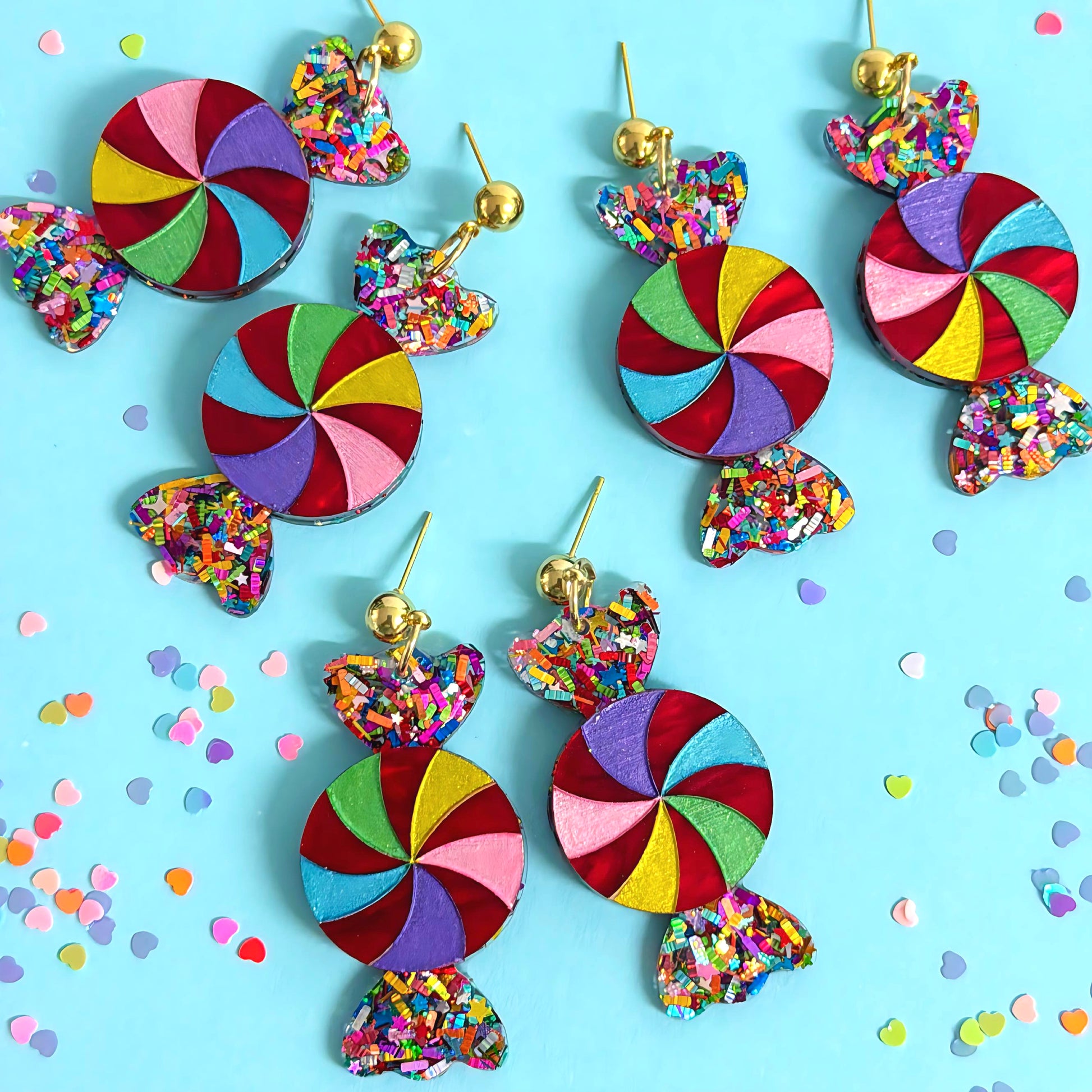 HELLO CHRISTMAS SWEETIE BON BONS : Rainbow Tinsel : Handmade Resin & Acrylic DROP Earrings