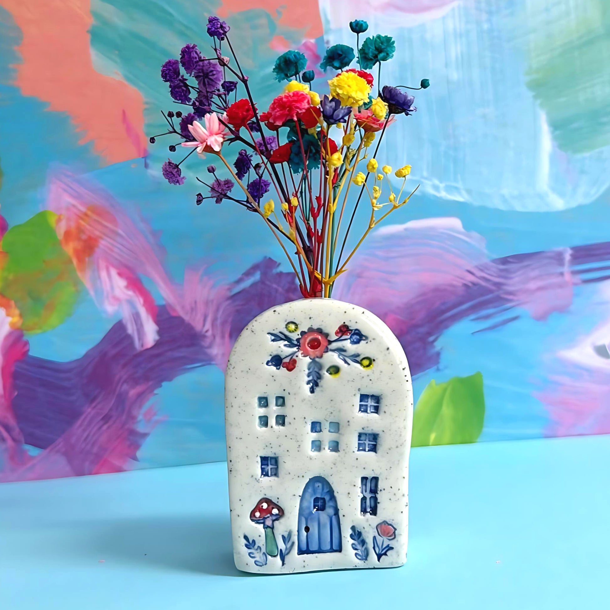 Each of these homes are formed by hand, starting with raw clay I sculpt & embellish them as one of a kind creations. Every home is signed on the base by me.