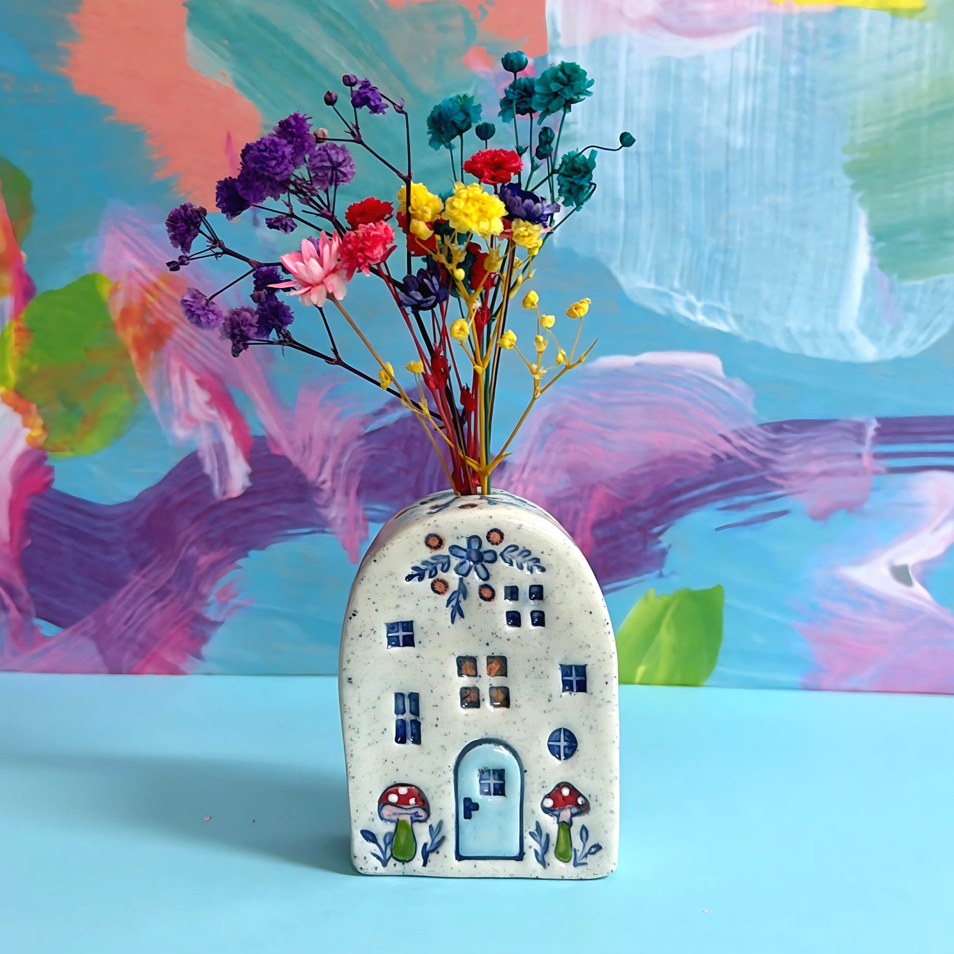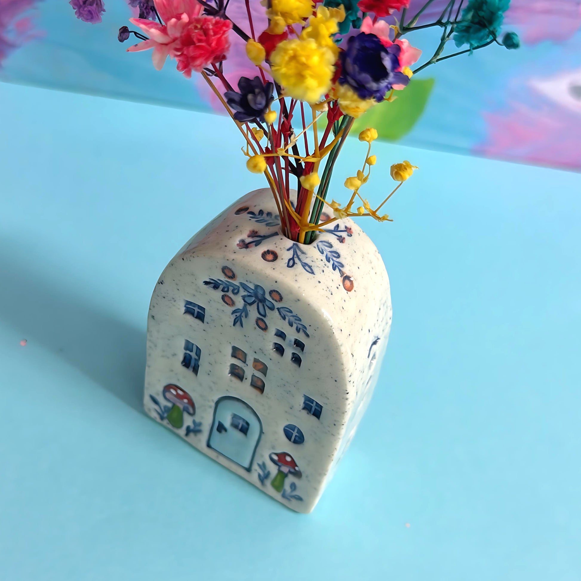 Each of these homes are formed by hand, starting with raw clay I sculpt & embellish them as one of a kind creations. Every home is signed on the base by me.