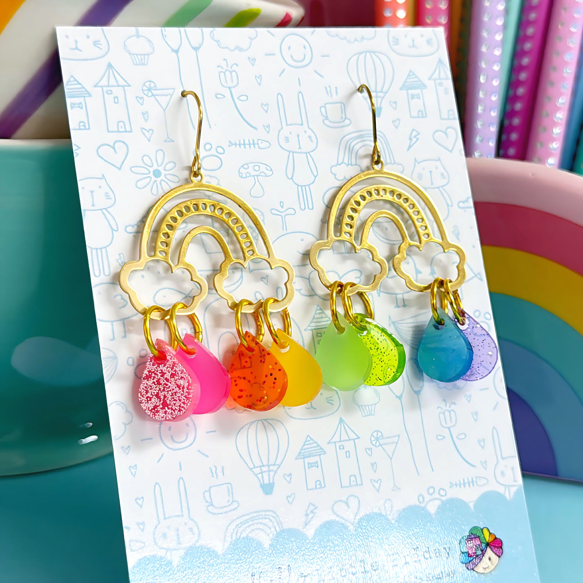 IT’S RAINING RAINBOWS SPARKLES : Antique : Handmade Brass & Acrylic DROP Earrings