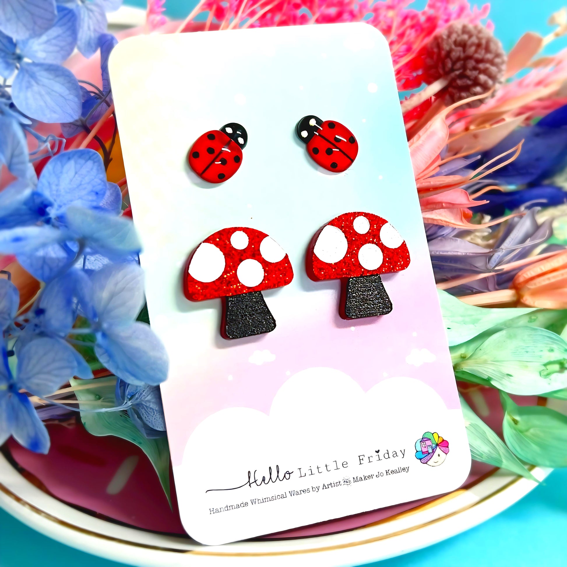 LADYBIRDS & MUSHROOMS SET : Handmade Acrylic STUDS