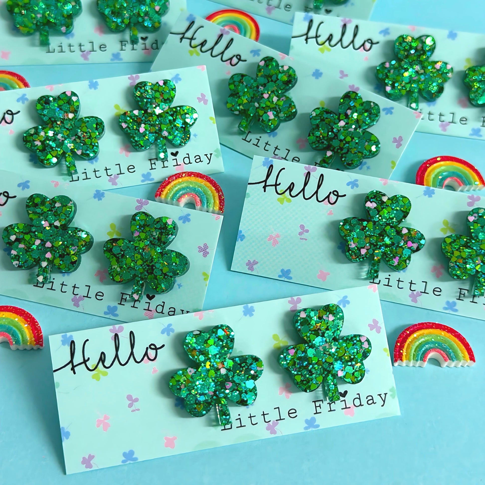 LUCKY CLOVER EMERALD SHAMROCK : Handmade Resin STUD Earrings