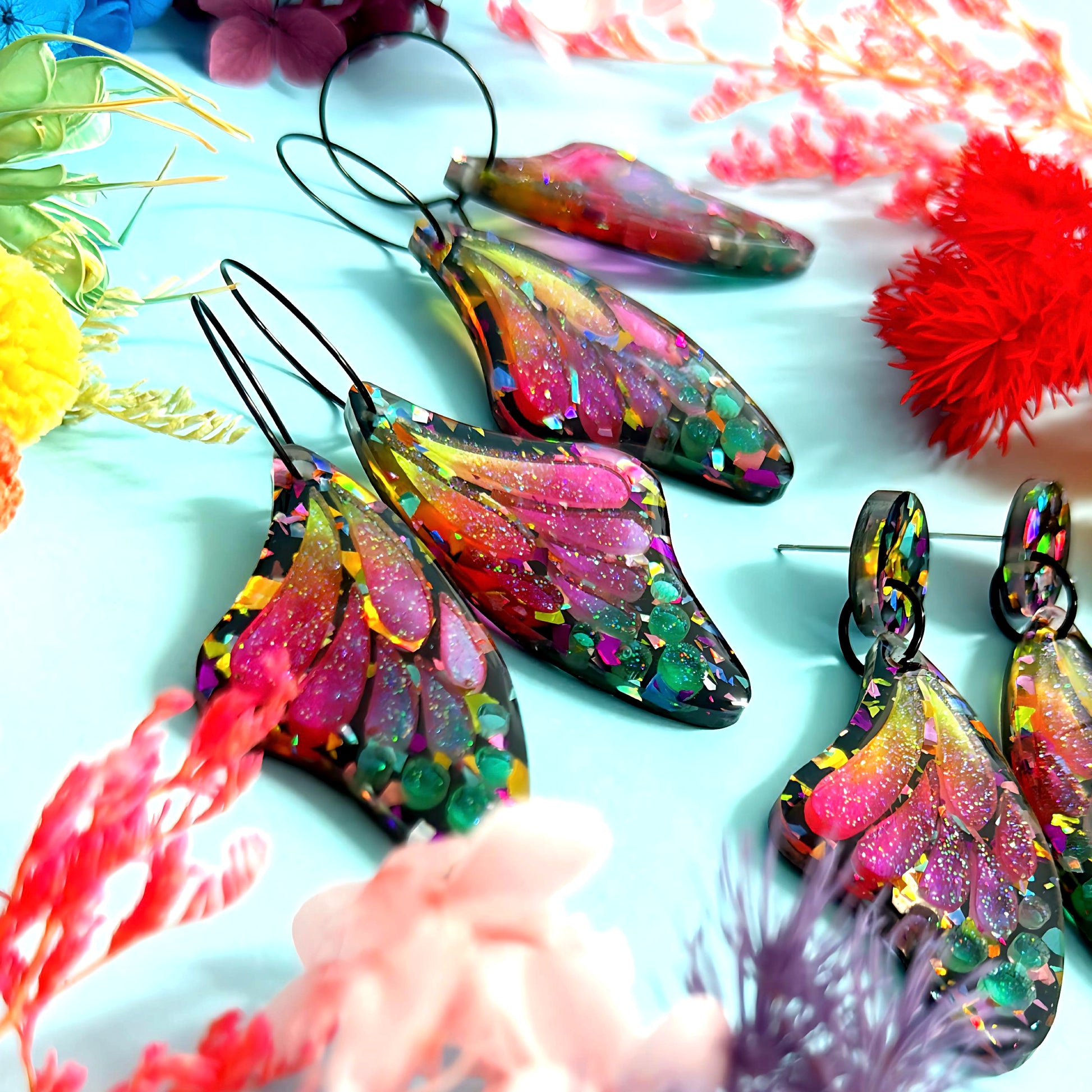 STAINED GLASS EFFECT MAGICAL RAINBOW WINGS : Butterfly Fairy : Handmade Holographic Resin & Acrylic DROP Earrings