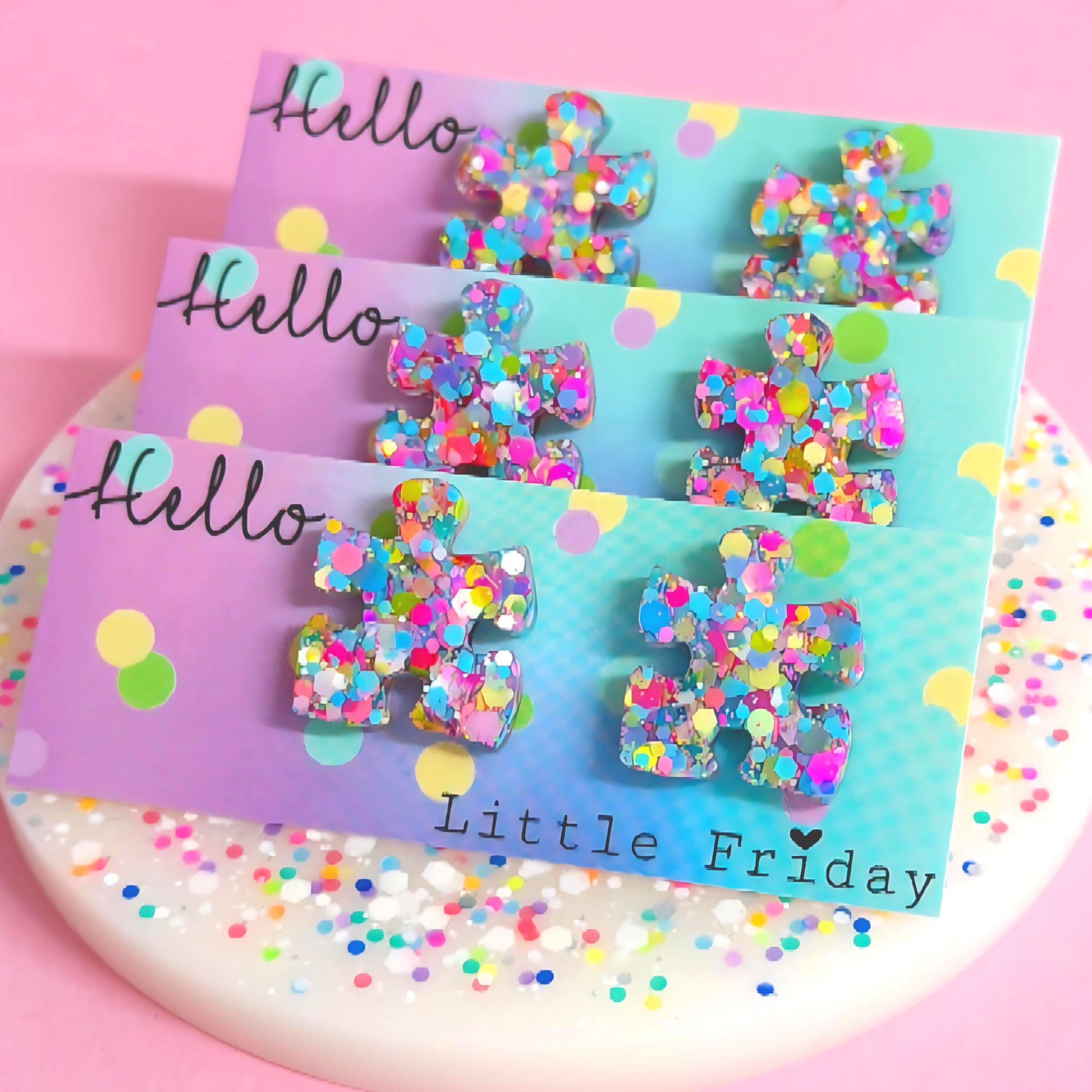 PUZZLE PIECES : RAINBOW CONFETTI : Handmade Resin STUD Earring