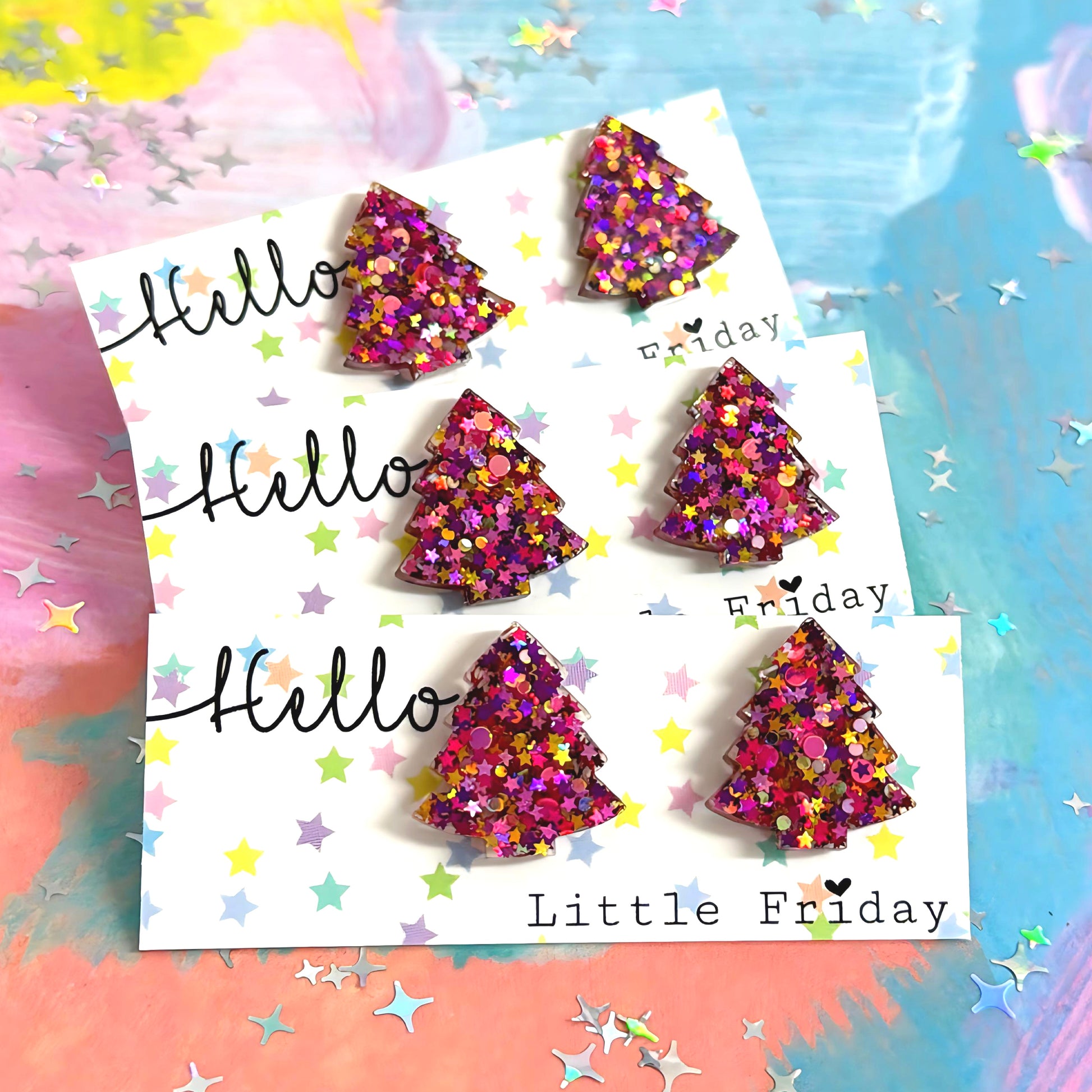 RUBY STARDUST CHRISTMAS TREES : Handmade Resin STUD Earrings