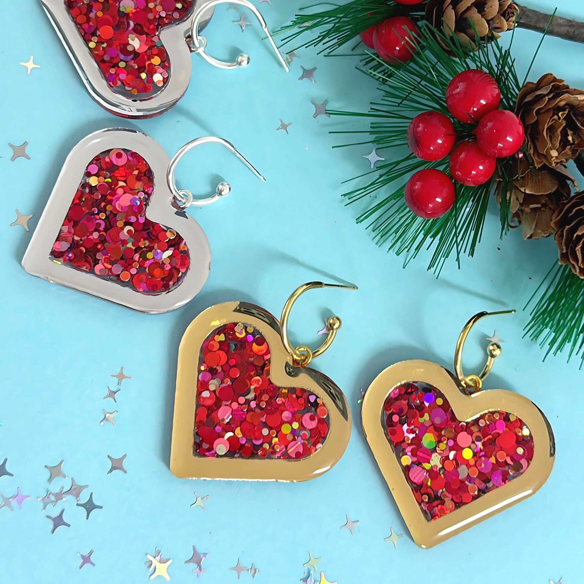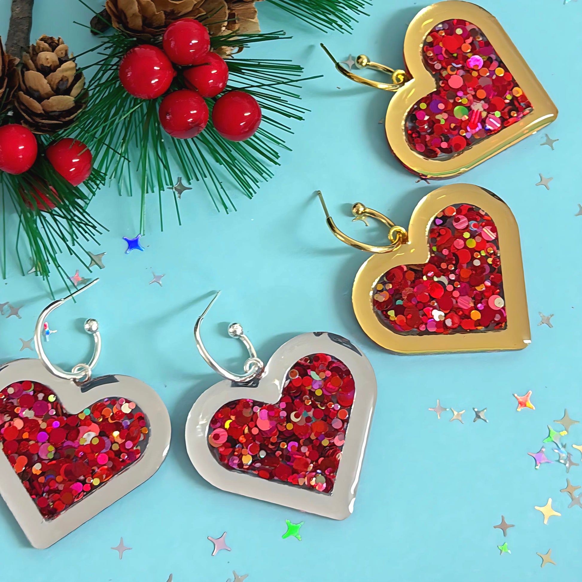 SCARLET CONFETTI HEARTS : Choose silver or Gold Handmade Resin & Acrylic DROP Earrings