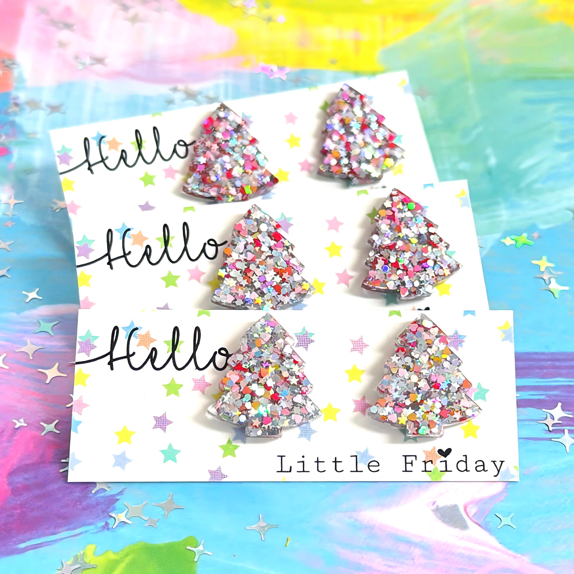 SILVER STARDUST CHRISTMAS TREES : Handmade Resin STUD Earrings