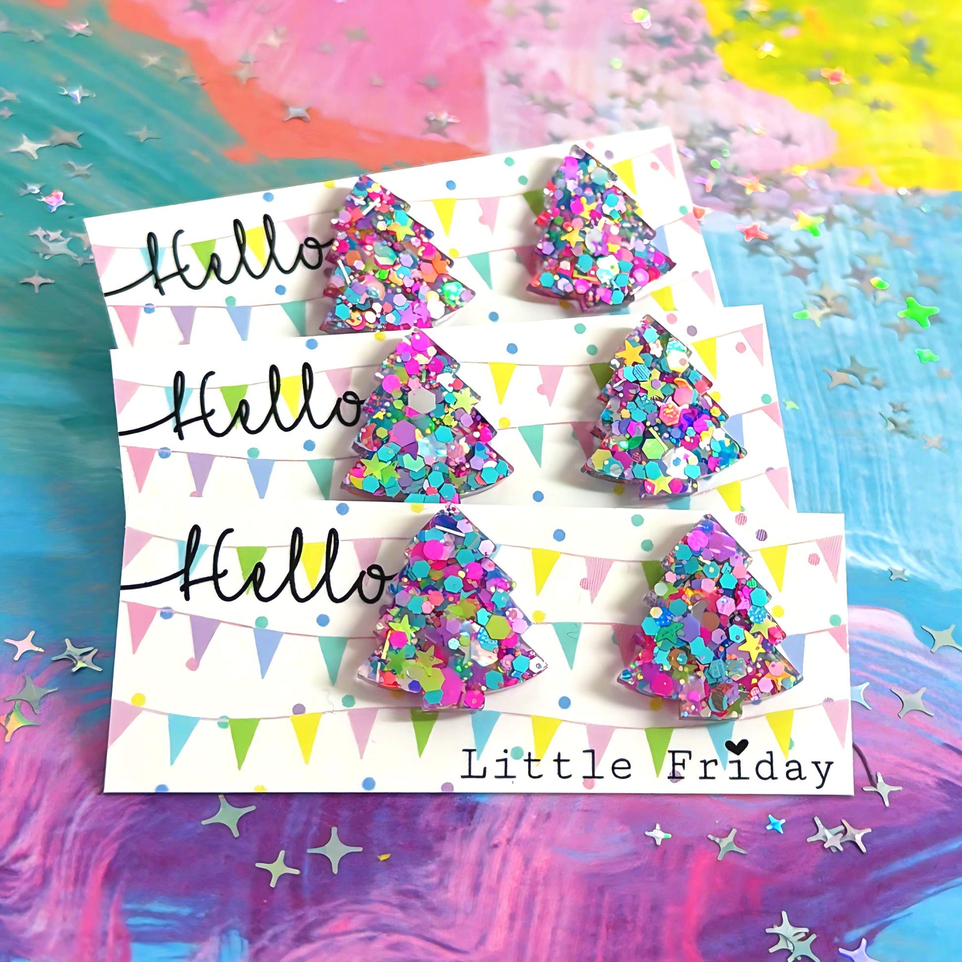 VIBRANT RAINBOW CONFETTI CHRISTMAS TREES : Handmade Resin STUD Earrings