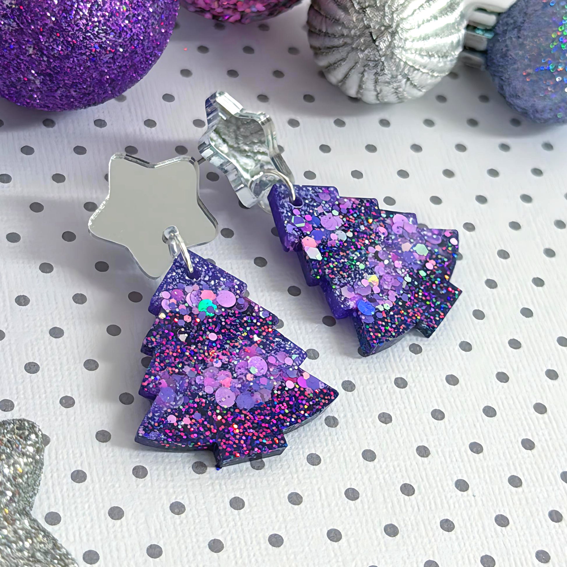 TWINKLING LIGHTS : VIOLET CHRISTMAS TREES : Handmade Resin & Acrylic Stud-top DROP Earrings